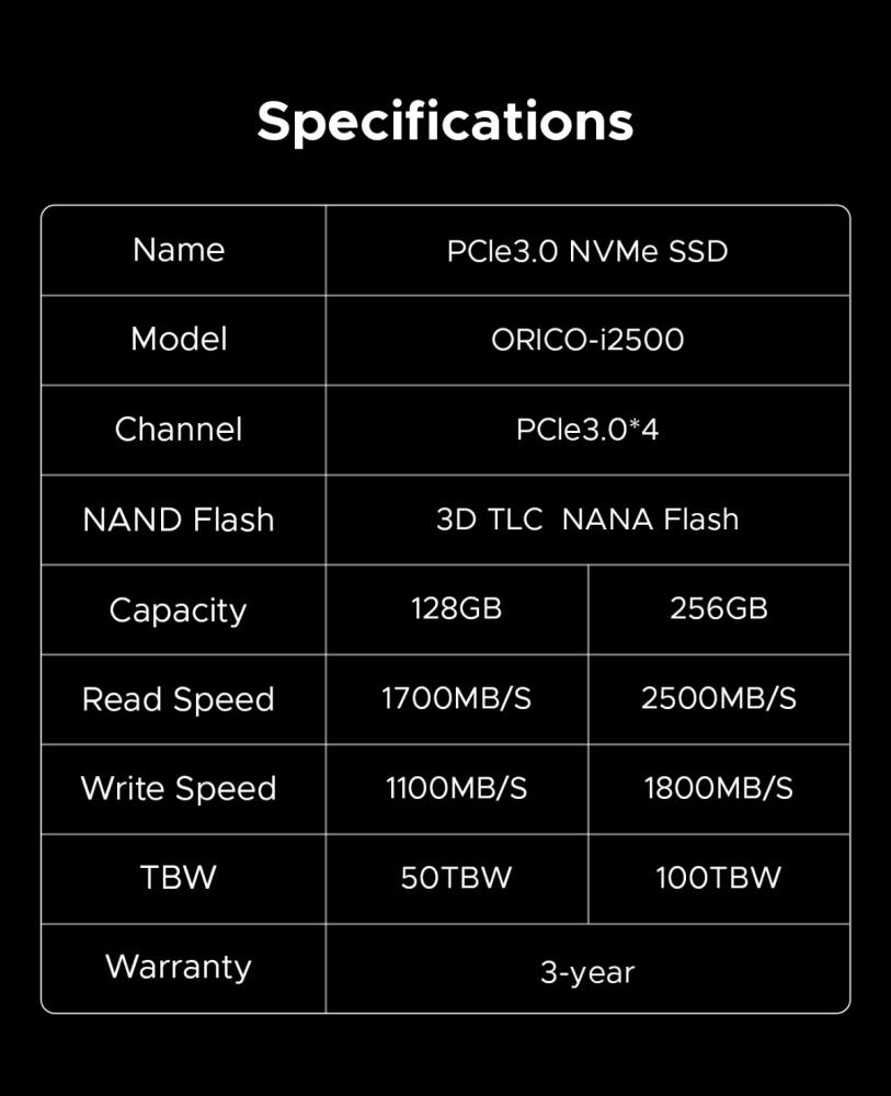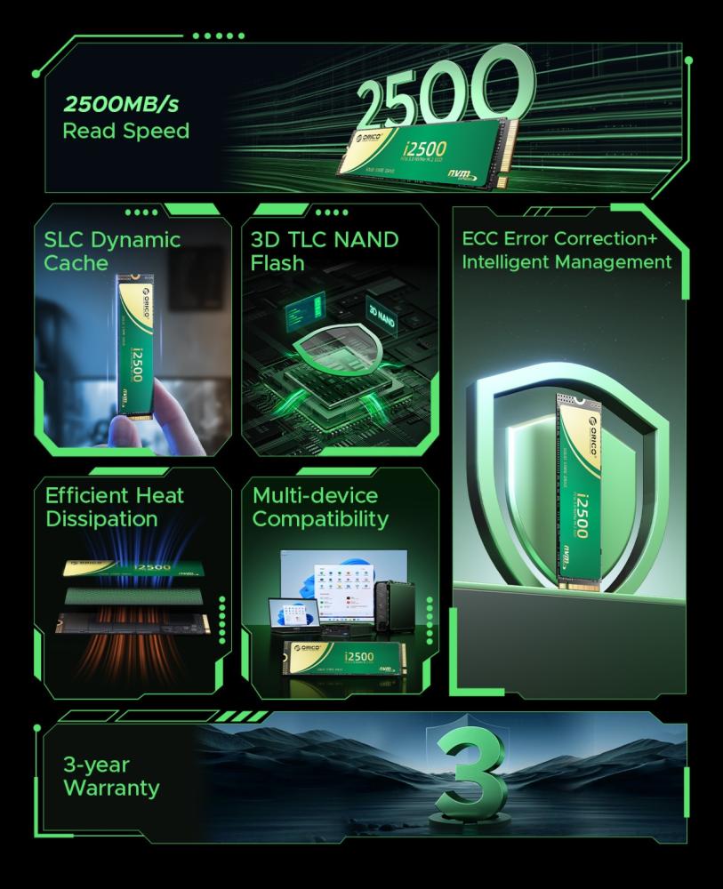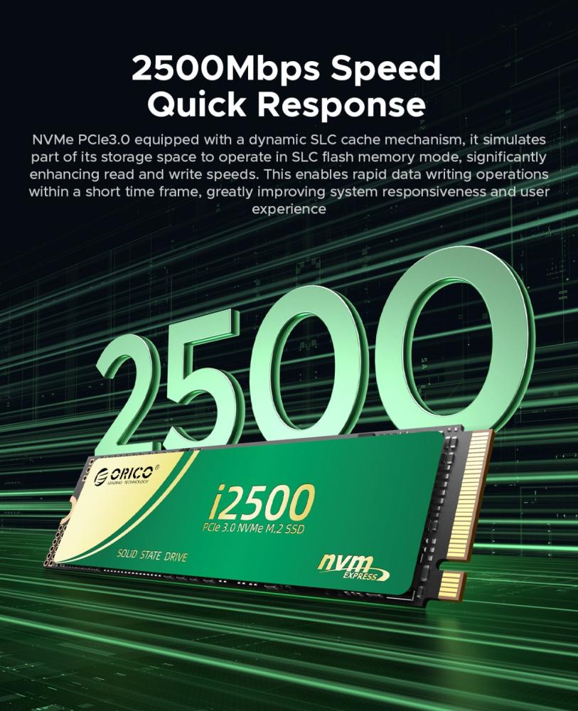 The ORICO i2500 is a high-performance 128GB M.2 NVMe 2280 SSD designed to significantly boost system speed. Utilizing the PCIe 3.0 x4 interface, it delivers impressive read speeds of up to 1700MB/s and write speeds of up to 1100MB/s. It features an SMI controller and 3D TLC NAND flash memory for reliable and efficient performance. With a TBW (Total Bytes Written) of 50TB, it offers good endurance for everyday computing tasks. ORICO backs this SSD with a 3-year warranty.